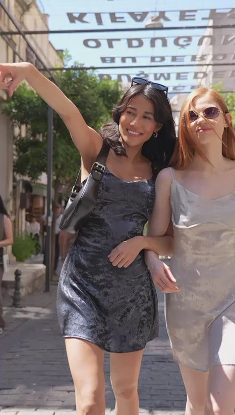 Jakarlı dokulu Milan saten kumaşıyla öne çıkan bu askılı mini elbise, yaz stiline zarif ve feminen bir dokunuş katar.